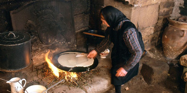 På 30 000 år gamla slipverktyg har man hittat stärkelsekorn vilket tyder på att kockar från stenåldern utvann mjöl ur kaveldun och ormbunksväxter - blandat med vatten och bakat på en hett smörjat berg. Resultatet kan ha likhet med en skeppsskorpa eller moderna crepe, eler liknande som bakas på varm plåt.